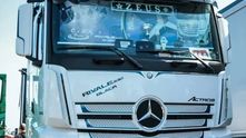 Mercedes-Benz Actros из Италии. Пакет доработок довольно стандартный: низкая хромированная "губа" под бампером со светодиодными фонарями, "люстра" и пневмогудки на крыше.