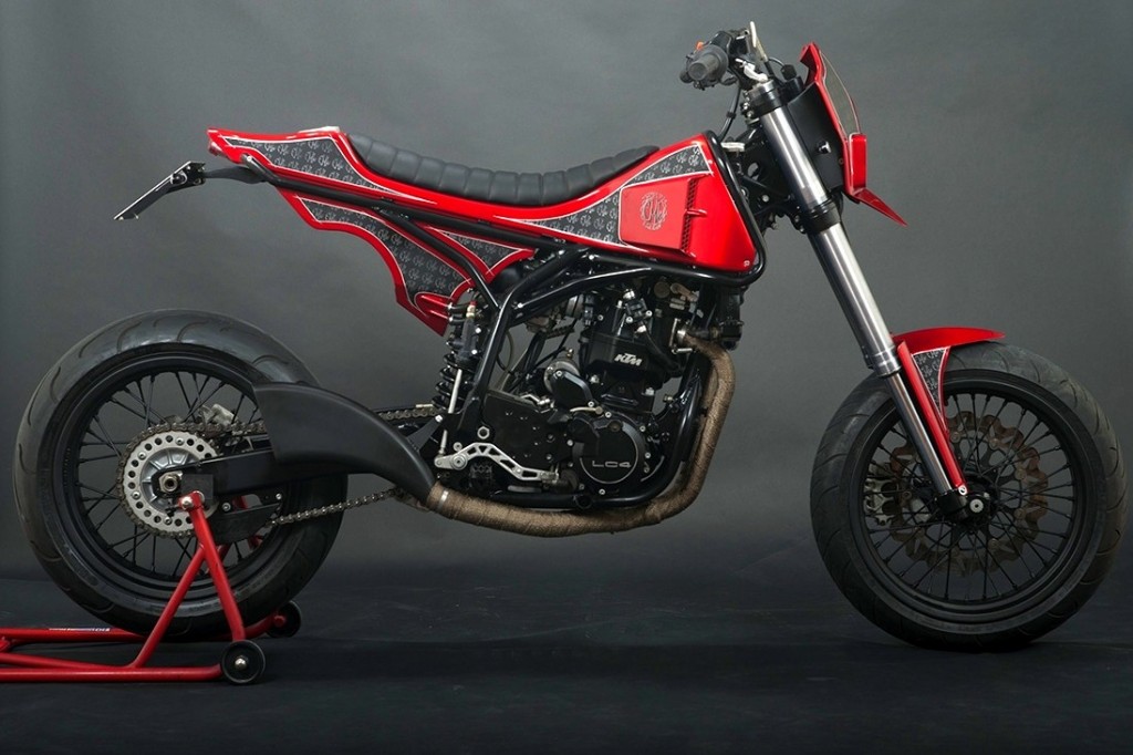 Прямые линии предали мотоциклу агрессивности и игривости, вместе с тем, косметические изменения, никак не повлияли на его функциональность. В первую очередь, хочется отметить, что у него просто огромный бензобак, так что его владельцу теперь не придется смущаться, услышав фразу “какой у тебя большой!” Основная часть собранного вручную бензобака расположена под сидением, он сделан из алюминия высокой прочности и умещает такое количество топлива, о котором стандартный KTM 640 даже не мечтает.