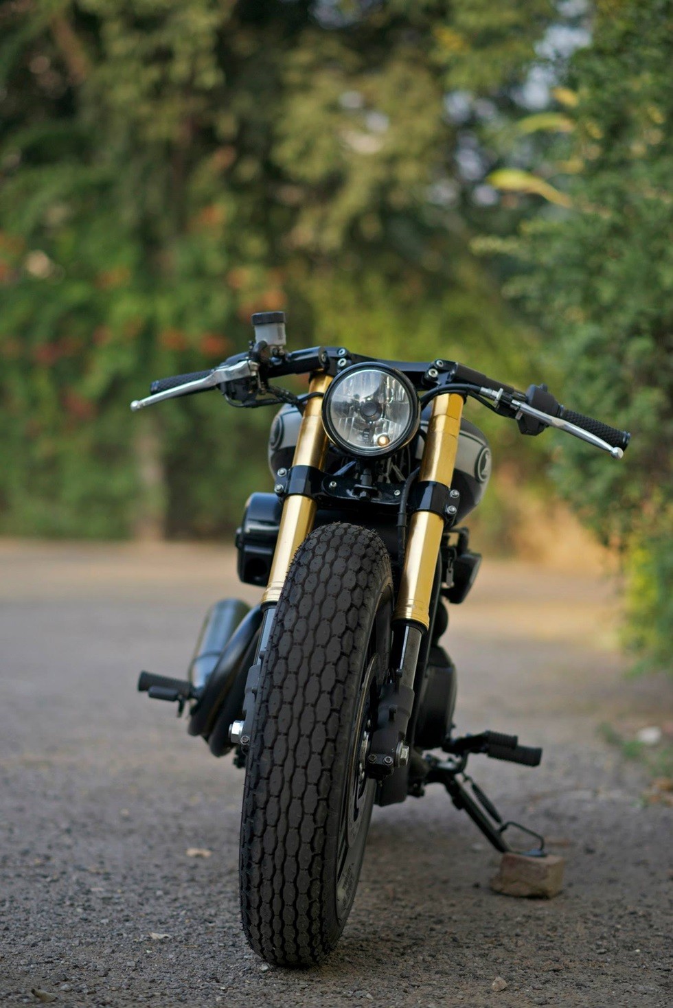 Топливный бак переделан и перекрашен. В задней подвеске вместо двух амортизаторов применили модный моноамортизатор. Установили армированные шланги. Главное преобразование - вместо ременной передачи поставили цепную с гоночными звездочками. Модернизирован подрамник, перешито седло. Резина Coker с колесами и ступицами от Harley-Davidson 1948 года. Ну и на финал - кастомные клипоны с ручками Arlen Ness.