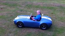Копия Shelby Cobra сделана из стеклопластика с стальным каркасом. У машинки даже есть свой маленький двигатель, расположенный в заднем отсеке. Он представляет собой мотор газонокосилки Honda GX31 4-stroke, с электростартером и даже центробежной муфтой. Так как его мощность всего 1,5лс, а вес автомобиля 50кг – не стоит ожидать каких-то сумасшедших скоростей (да и к чему они ребенку).