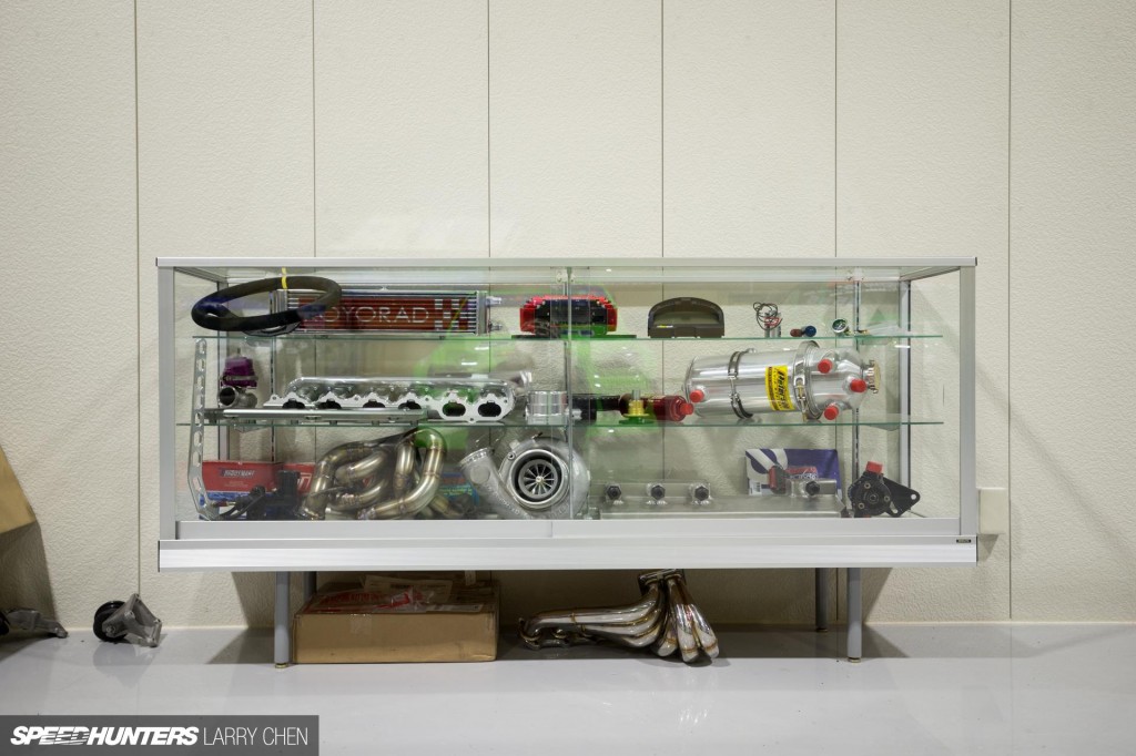 В главном гараже, кстати, мы заметили небольшой выставочный бокс, до краёв заполненный клёвыми деталями, в том числе масляным радиатором Koyorad, приборкой Racepak и впускным коллектором Hypertune для 2JZ.