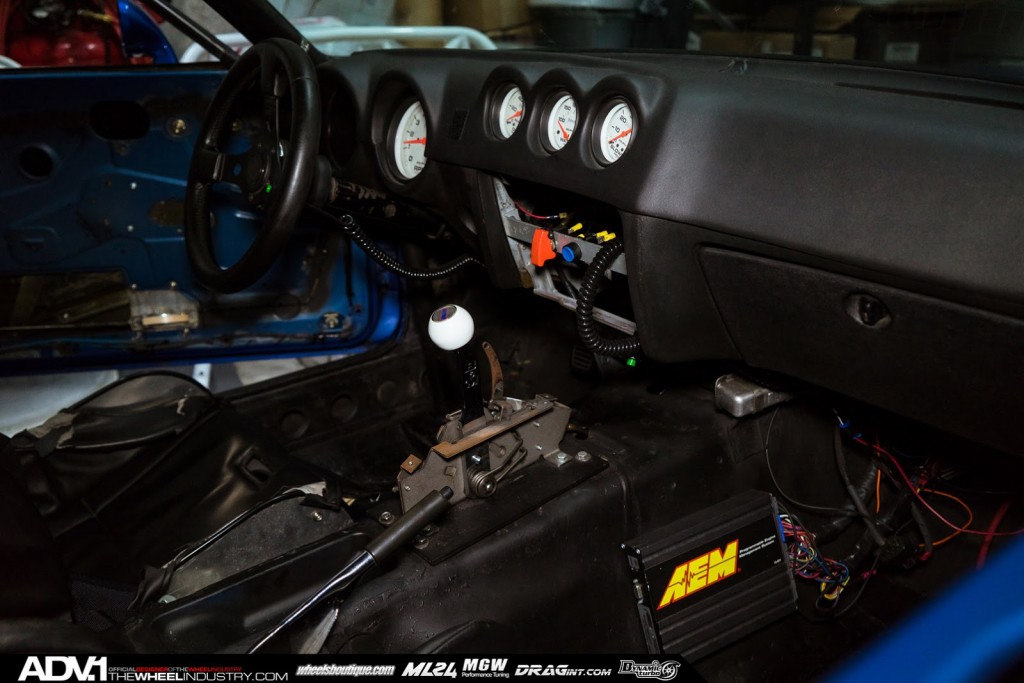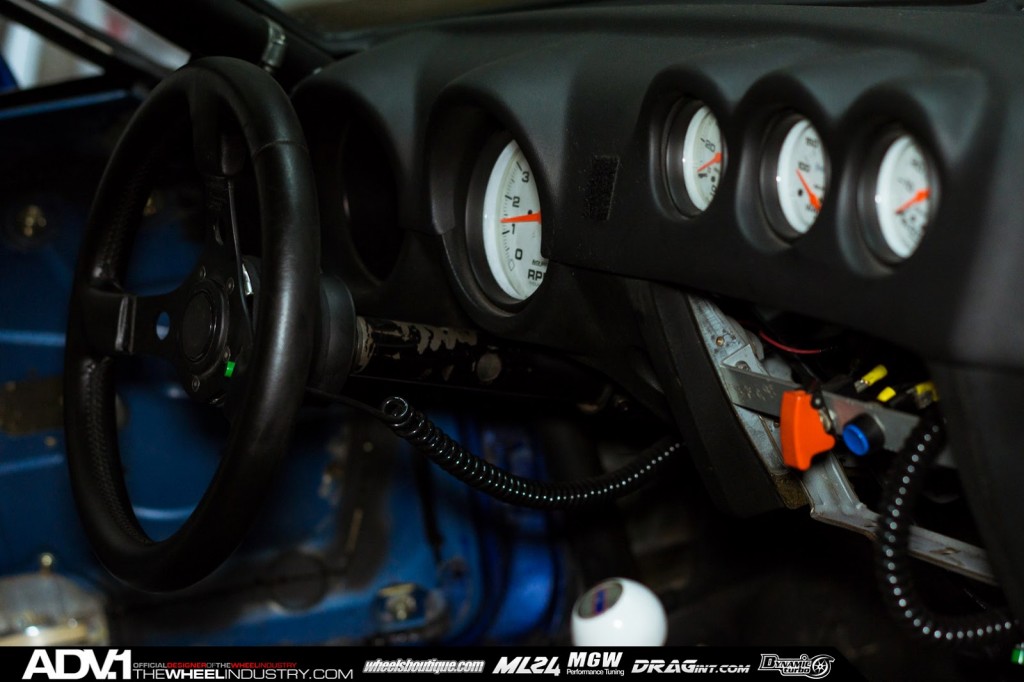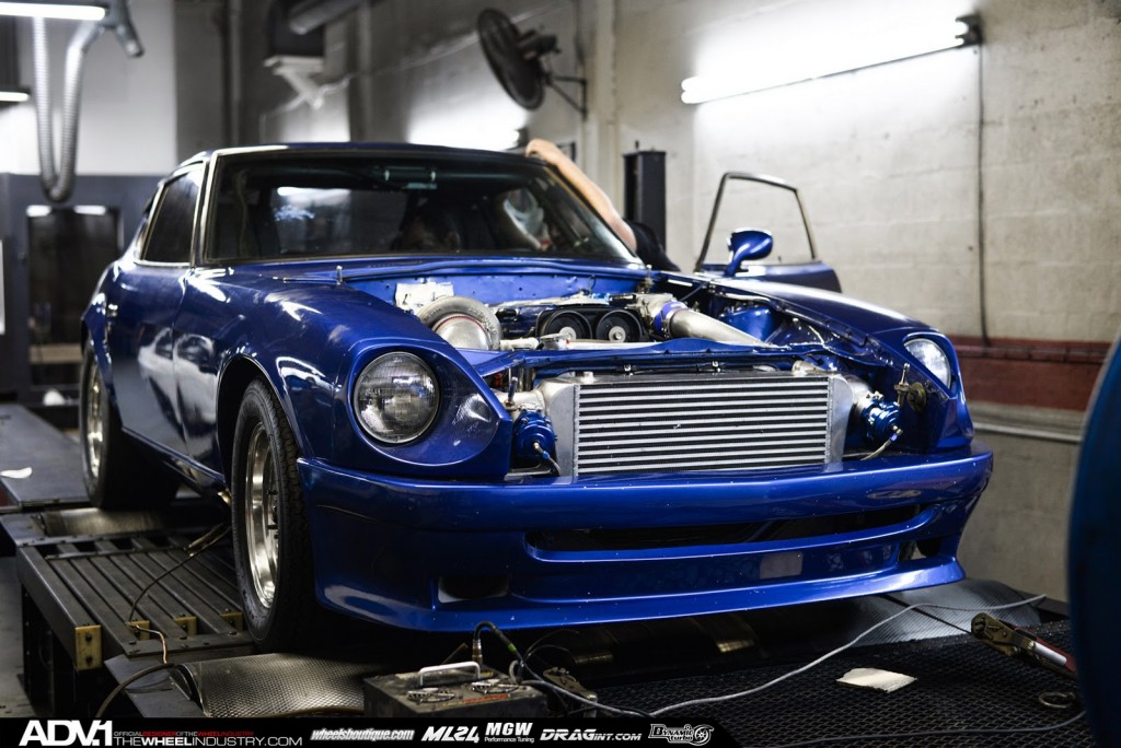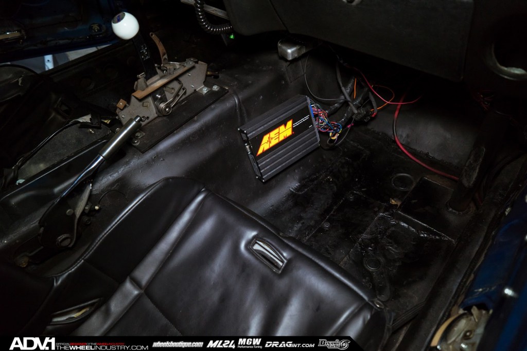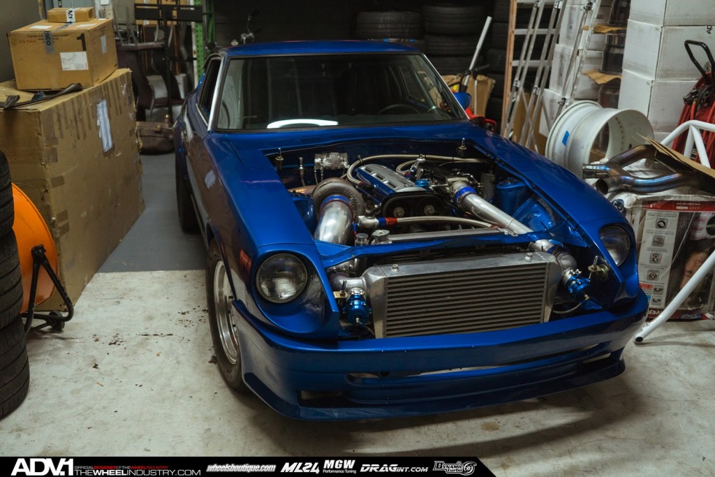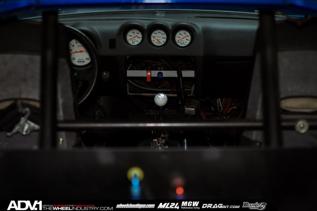 Также на синий Datsun были установлены турбина Garrett Gt42gtx, каркас безопасности, 6-ступенчатая коробка передач Getrag с двухдисковым сцеплением, комплект амортизаторов KYB с пружинами Eibach, и конечно же колесные диски ADV.1 Wheels.