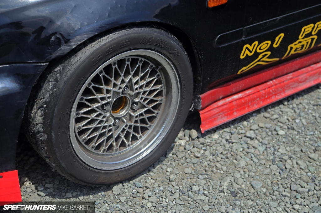 Ещё одну важную роль в жизни этого Civic играют колёса и покрышки. Как вы видите, спереди Хирата-сан использует более широкие и цепкие колёса - в данном случае SSR Mesh, обутые в резину Federal 595 RSR.