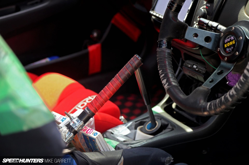 Что по подвеске? Не будем скрывать, она очень важна. Хирата-сан рассказал мне, что на его машине стоит комплект разных койловеров спереди и сзади, и, как вы уже могли догадаться, задняя пара намного жёстче для того, чтобы срывать машину в занос.