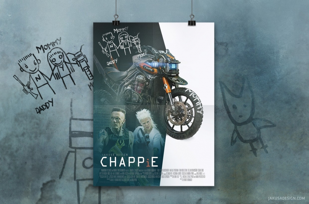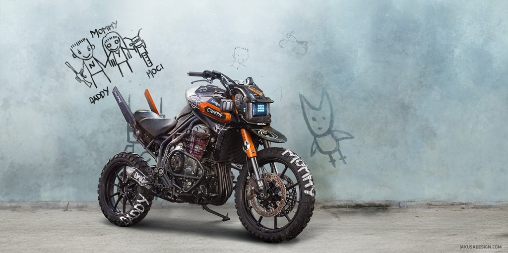Работники Jakusa полностью изменили переднюю часть мотоцикла, добавили светодиоды, которые изображают глаза робота Чаппи, а окантовка передней фары напоминает его лицо.