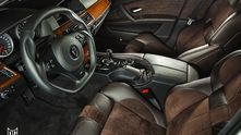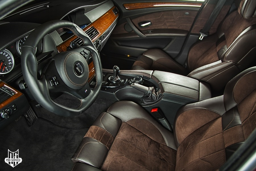 Автомобиль получил фирменный салон от Pro — Service. Все материалы владелец автомобиля выбирал сам и за основу мы взяли салон немецкой компании " G — power ". Конечно, салон автомобиля получится достаточно оригинальным, чего только стоило изготовление анатомического руля, который был сшит специально под хват владельца. Мы без преувеличения можем сказать, что это один из лучших проектов по доработке салона — в нашем ателье. Автомобиль не нуждается в представлении, он постоянно находится под прицелами фото и видео — камер