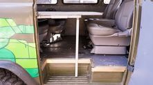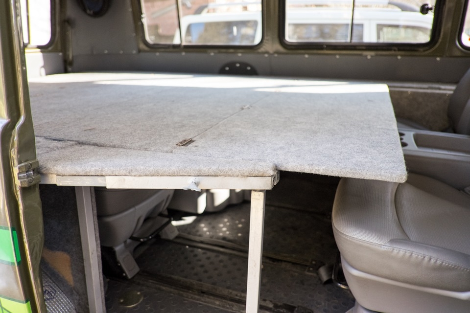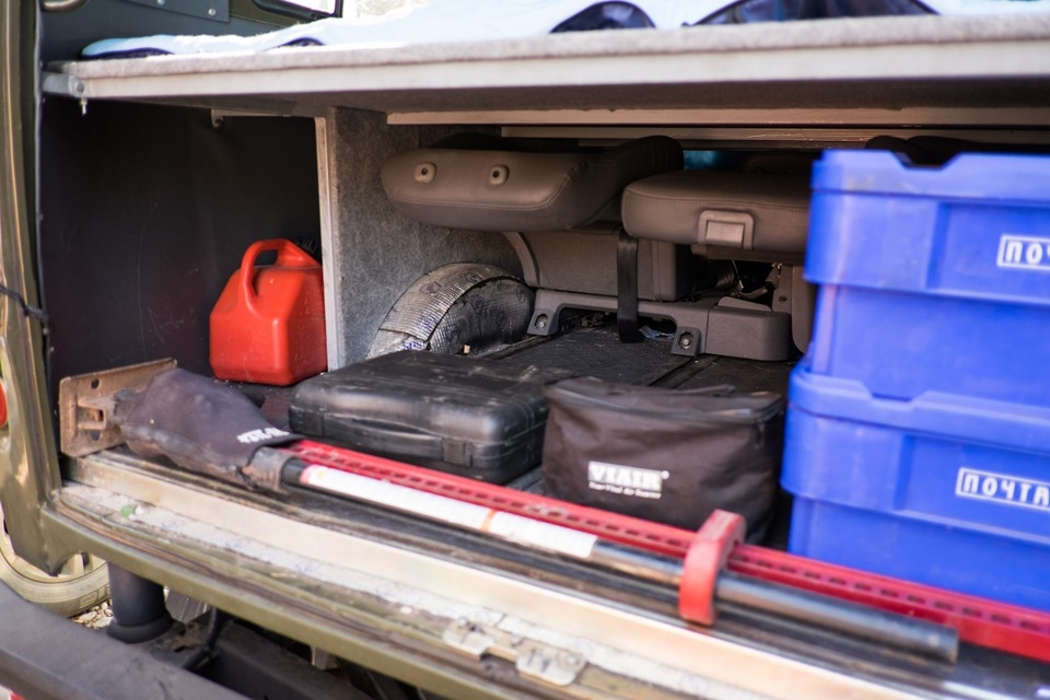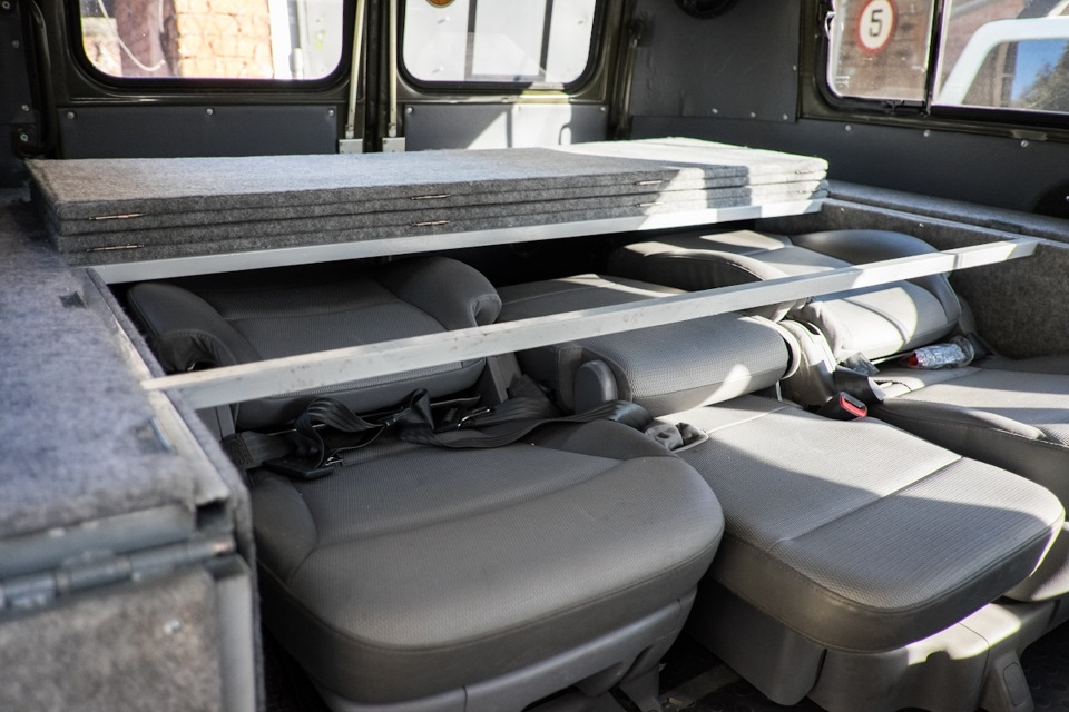 УАЗовские кресла не предусматривают откидывание спинки, так что комфортно путешествовать на дальние расстояния не получится. Пришлось штатный пассажирский салон выбросить и искать подходящий. В качестве донора для салона-трансформера выступил Hyundai Starex. Единственной проблемой оказалось поставить сиденья так, чтобы один ряд был полностью подвижным. Но и с этим справились. Также внутри соорудили из стального профиля спальник, одна откинутая часть которого делает неплохой столик для троих. В транспортном виде спальник превращается в полку, которую можно сделать подъемной за 5 минут. Появились пневматическая система и автономный отопитель салона.