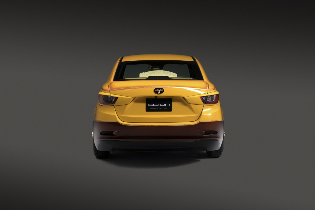 Пожалуй, самым интересным из показанных автомобилей, можно назвать вот этот концепт Scion iA Eddie Huang, выполненный в стиле классических лоурайдеров Лос-Анджелеса. Машина окрашена в желтый металлик, а на капот нанесено изображение панды, с которой ассоциирует себя сам владелец автомобиля. Конечно, вы не могли не заметить классические лоурайдерские колёса, окрашенные в золотистый цвет, которые так отлично сочетаются с золотистой радиаторной решеткой.