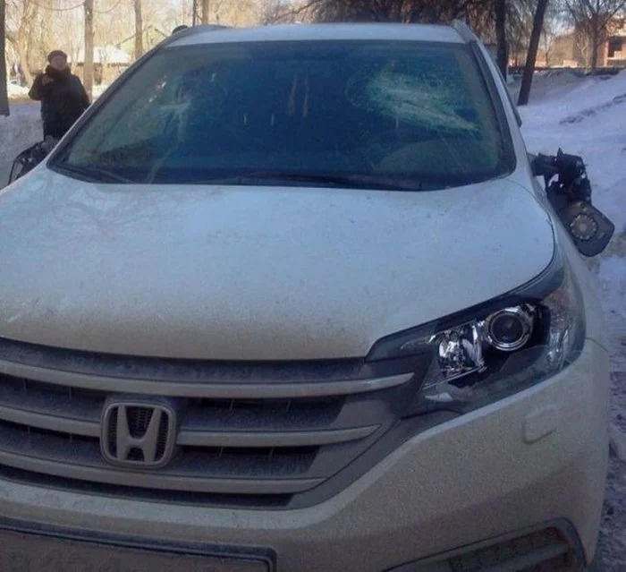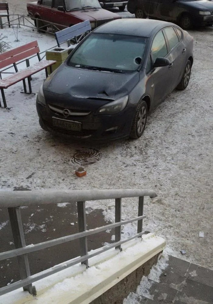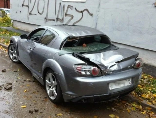 А эта ситуация произошла совсем недавно в Казани. Жителям дома надоело видеть припаркованный на газоне Mazda RX-8, в результате чего они сбросили на него сверху огромные булыжники. Автомобиль получил очень серьезные повреждения, и ремонт обойдется в кругленькую сумму.