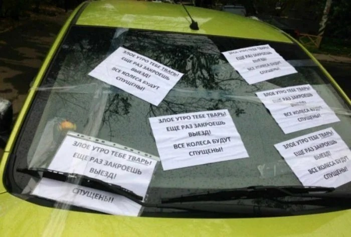 Есть и более безобидный вариант предупреждения - записки на стекло. Этот автолюбитель видимо сильно достал кого-то и получил не одно, а сразу 6 записок, после которых любой адекватный человек поймет свою ошибку.