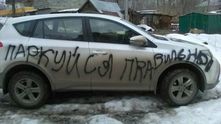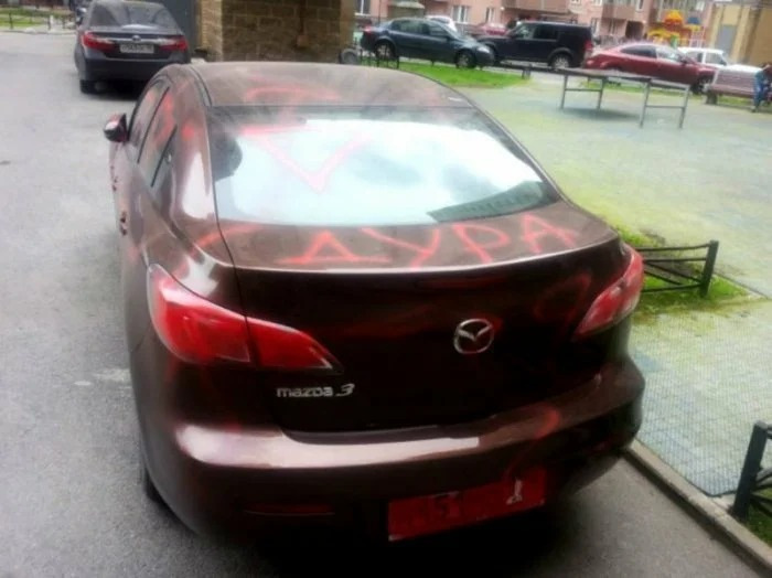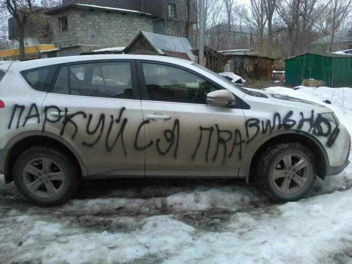 Но самая популярная месть жильцов - это нанесение различных слов баллончиком с краской прямо на кузов горе-автовладельца. Владельцу Land Cruiser написали "ГАЗОН", Toyota RAV4 - "Паркуйся правильно", целый ряд автомобилей на третьей фотографии также получил понятное обоснование недовольства.