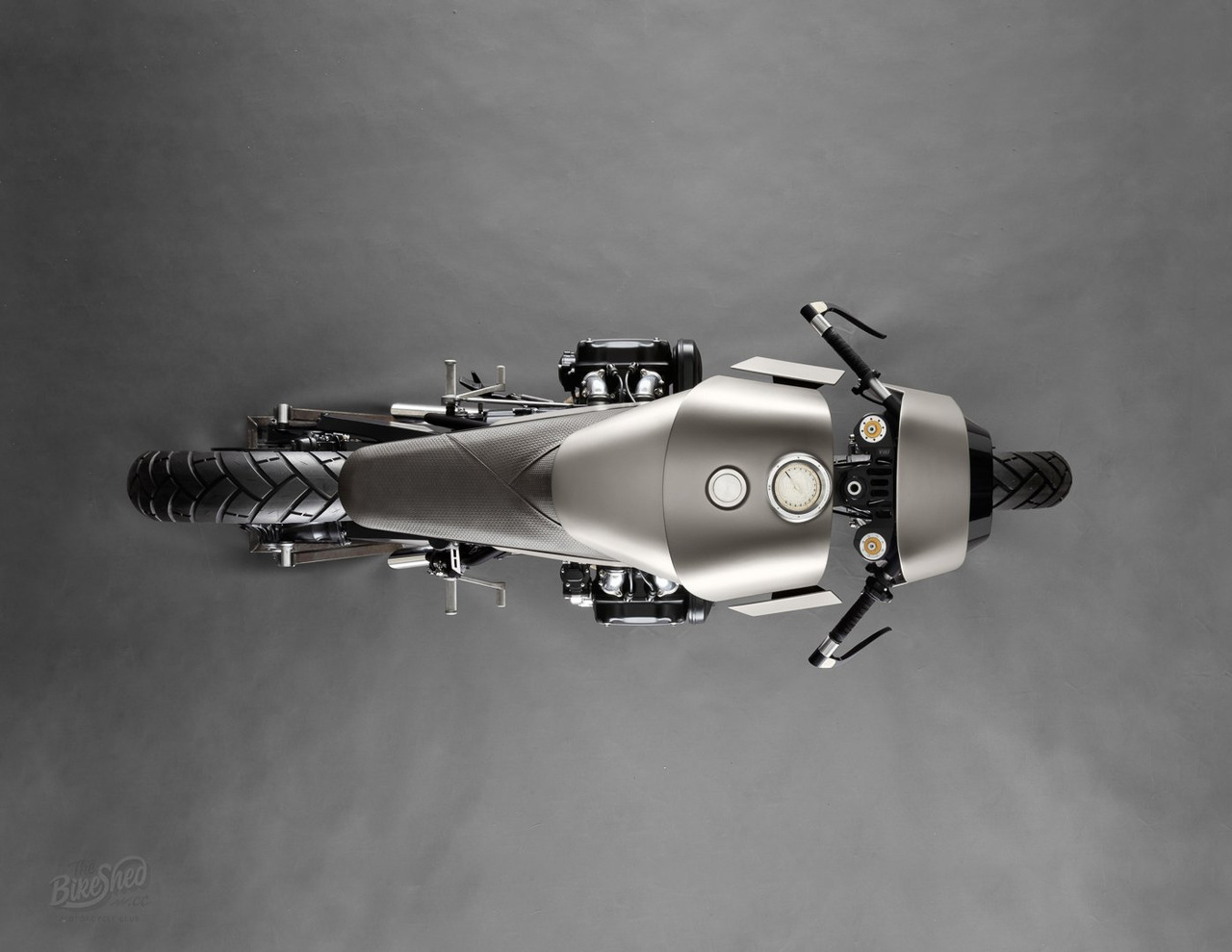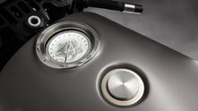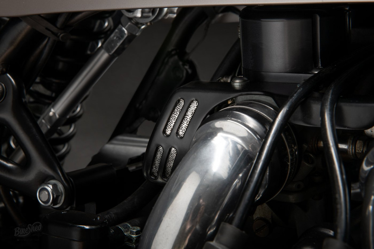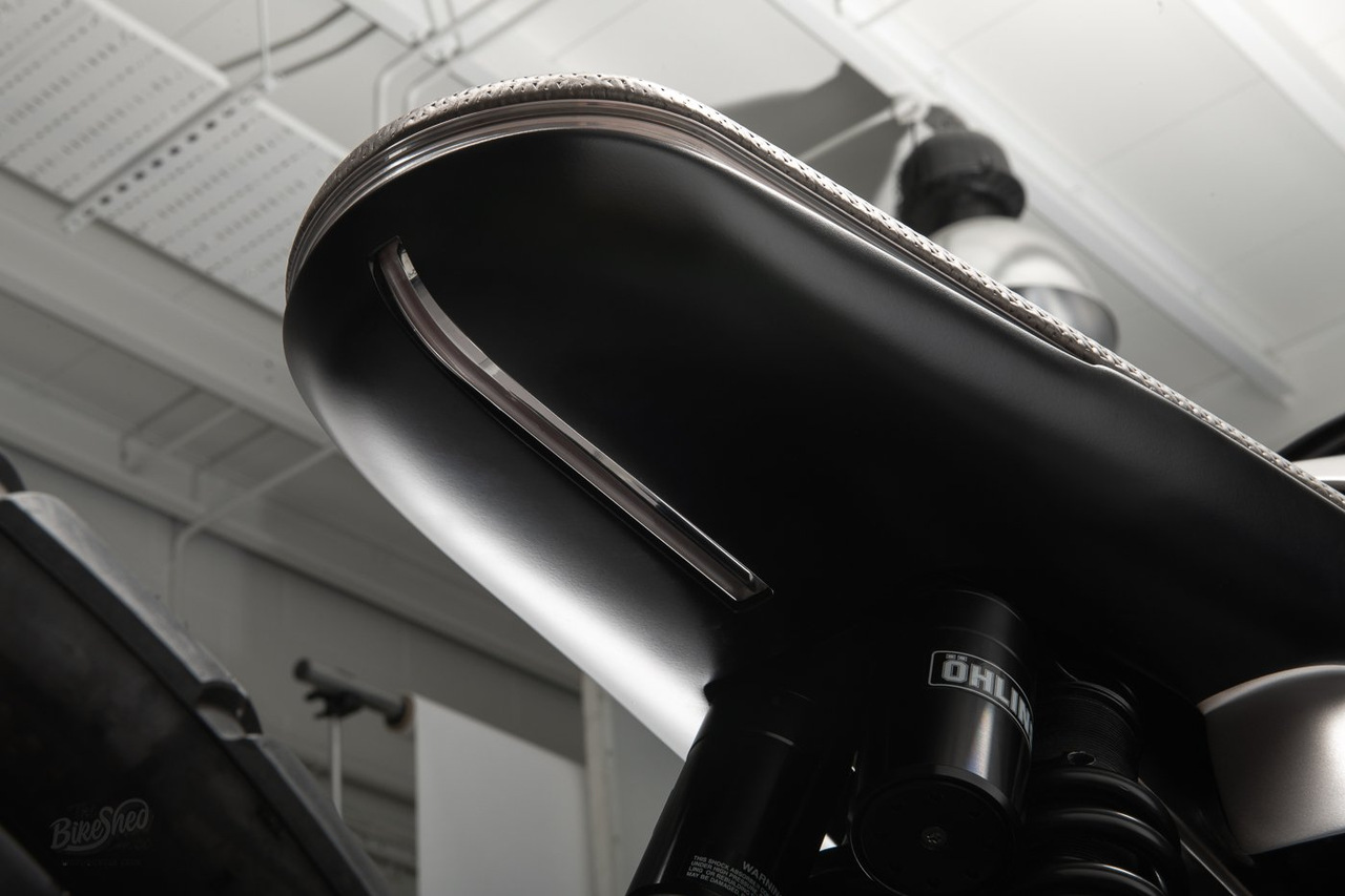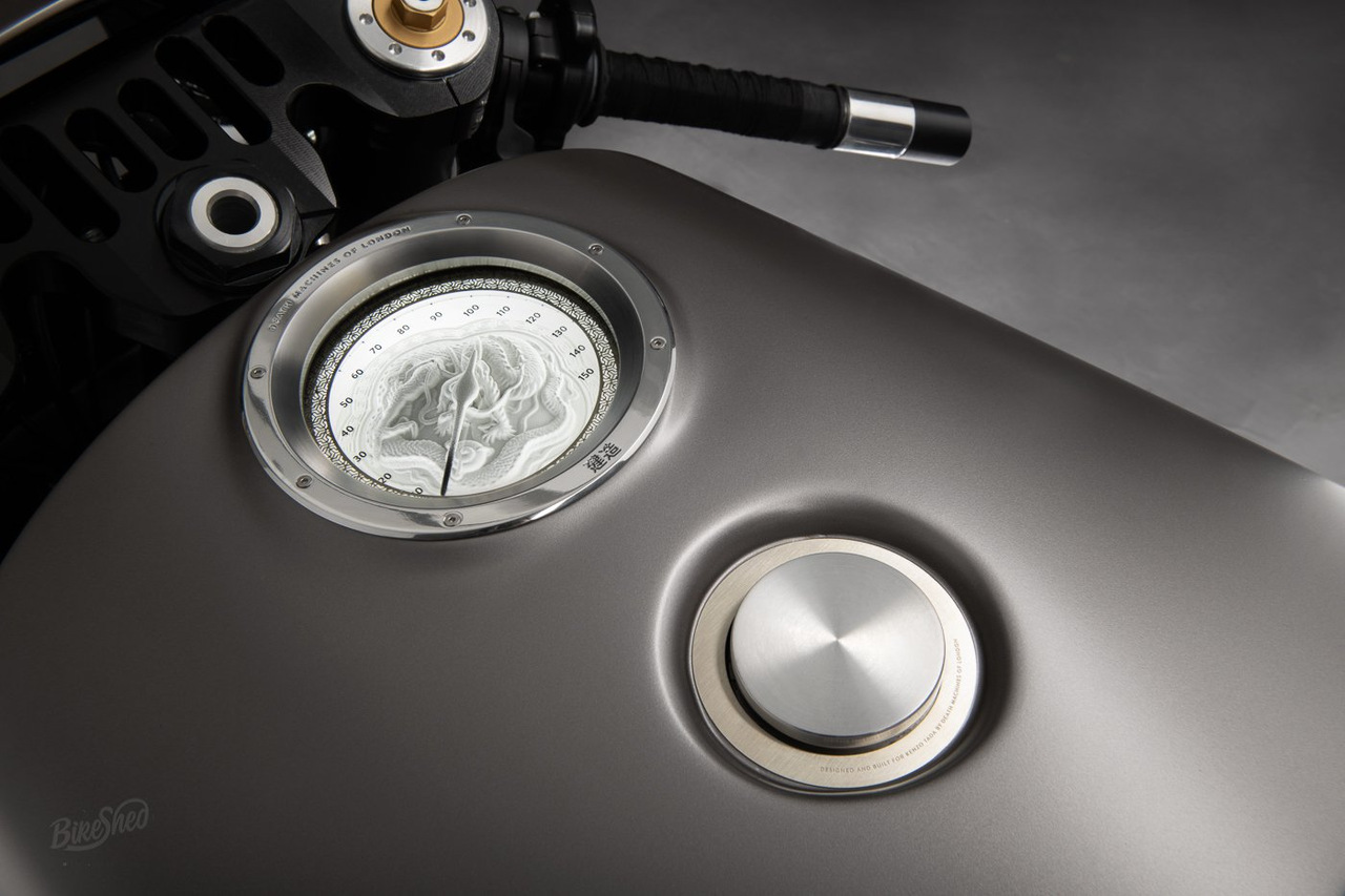 Еще один интересный элемент дизайна мотоцикла — замысловатый спидометр, изготовленный из шкатулки для драгоценностей 18-го века, а затем покрытый светорассеивающей пленкой и обрамлен наружной никелированной рамкой с точной узорчатой гравировкой. Блок фар, индикаторы и задний фонарь — все это кастомно-разработанные детали специально для данного проекта.