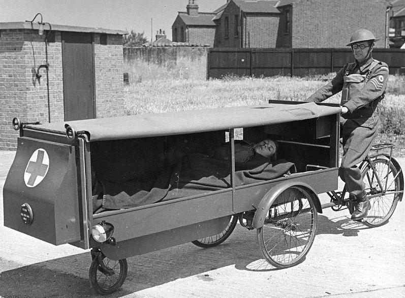 21 — Санитарный велосипед для эвакуации раненых с поля боя, разработанный для Home Guard.