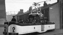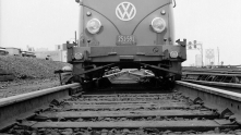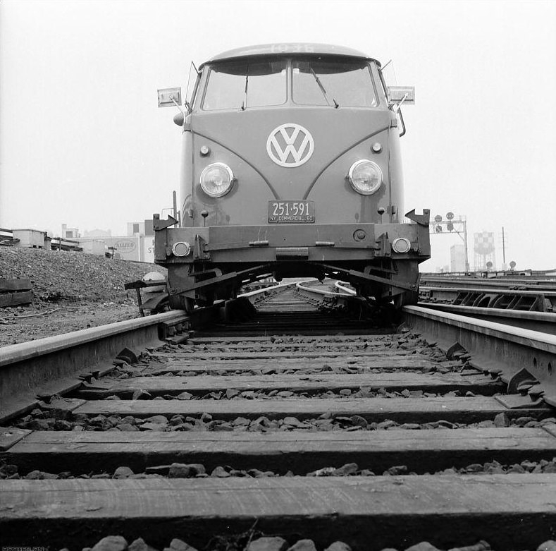 36 — Volkswagen, движущийся по рельсам железной дороги Лонг-Айленда. Этот универсальный автомобиль имел два комплекта колёс: резиновые для дорог и металлические для движения по рельсам. Теперь это называют локомобилями.