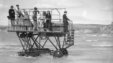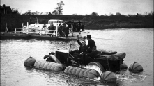5 — Капитан Малин на амфибии Riley спускается по реке Северн. Автомобиль установлен на переносной надувной системе и передвигается за счёт вращения задних колёс с небольшими лопастями.