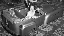 50 — Модель Гей Макгрегор демонстрирует новейший трёхколёсный Bond Minicar 1956 года в Лондоне.