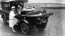 31 — Автомобиль-лодка Peugeot на берегу реки. Передняя часть выполнена как нос лодки, центральная — как автомобиль, при этом у него есть колёса.