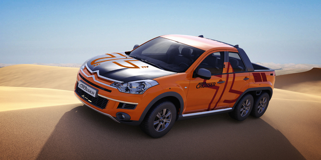 Шестиколесный пикап от Citroen удивил весь мир, когда сошел с конвейера. Он построен на базе первого внедорожника французской компании – C-Crosser – и был представлен на Женевском автошоу. Несмотря на неплохие показатели проходимости, автомобиль безвреден для окружающей среды, поскольку оснащается гибридным двигателем. Конечно, не совсем безвредным, но если вы хотите полностью устранить выбросы – существует функция Zero Emission, при которой работает только электромотор и ведущей остается только задняя ось.