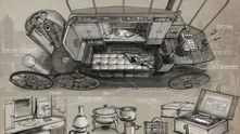 Очень классные скетчи на тему раннего стимпанка. Альтернативный мир, загрязненный чем-то отравляющим, заставит людей создавать вот такие передвижные жилые дома. Обратите внимание, что даже лошади дышат через специальные маски. Гениально!