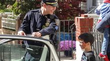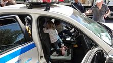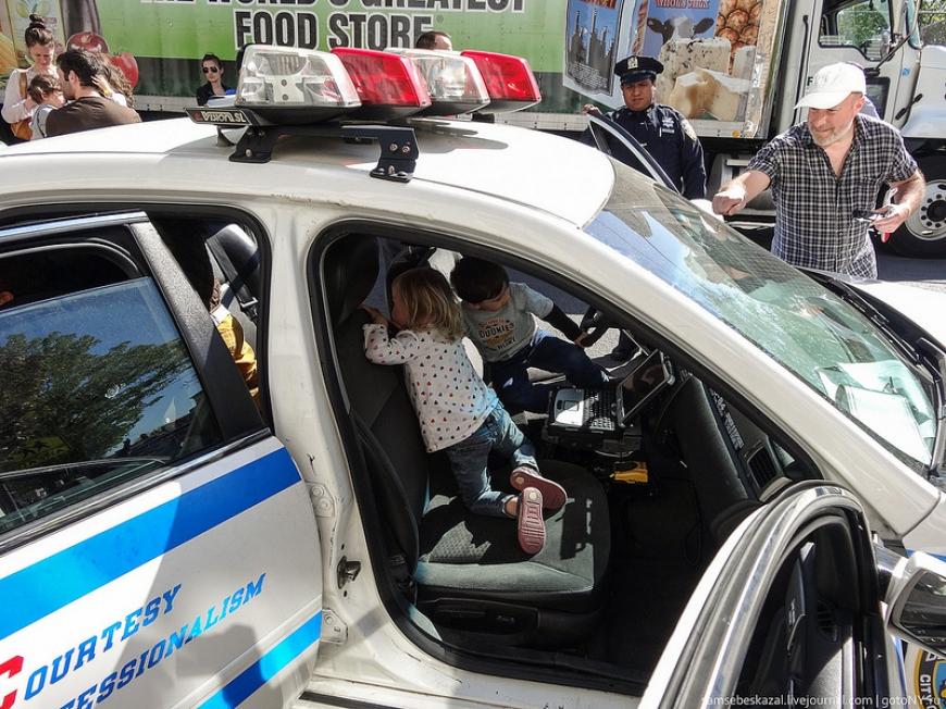 Дети внутри ведут себя, как на игровой площадке. Открыли компьютер и принялись стучать по клавишам. Полицейские только стоят и улыбаются.