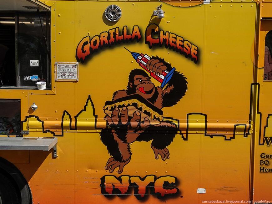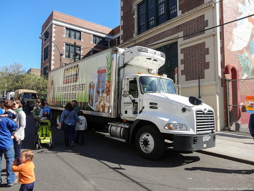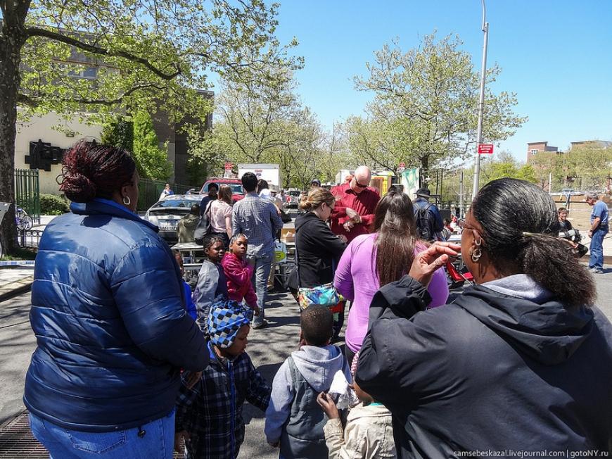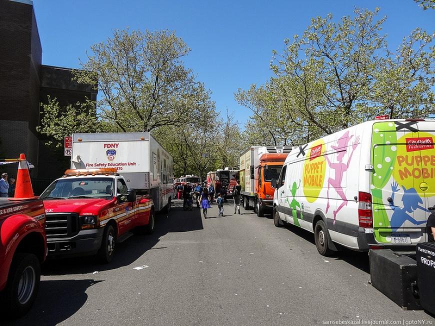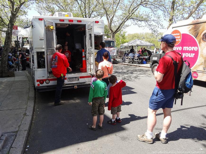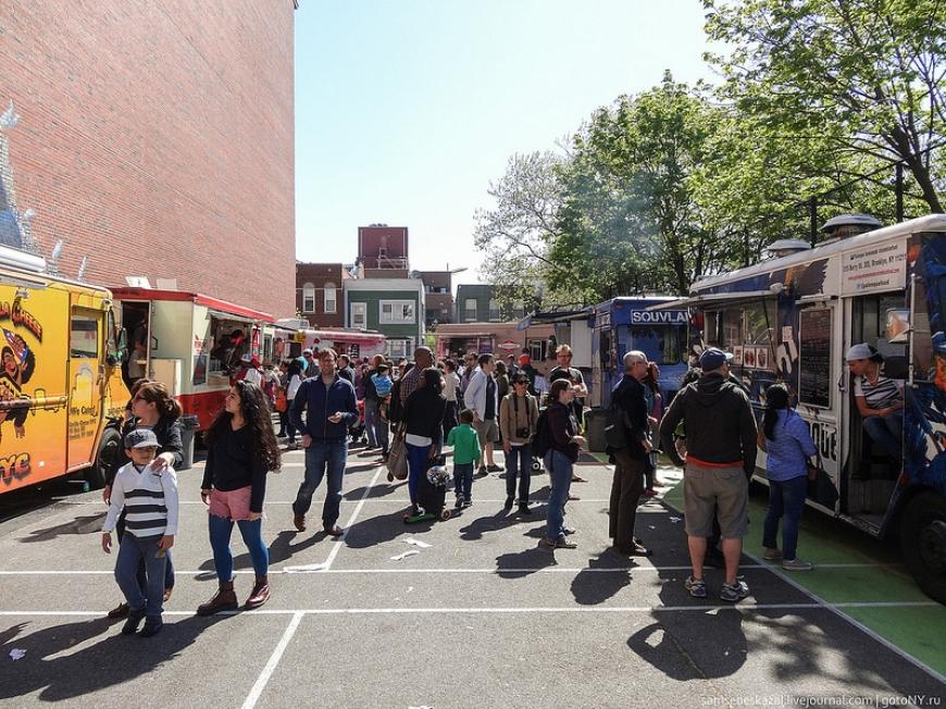 Кормили классическим нью-йоркским способом. На место приехала куча грузовичков-кухонь, которые продавали все, начиная от греческих шашлычков и заканчивая вафлями. Мы купили 2 яблока, 2 апельсина и 2 банана и одну бутылку воды. Отдали за все 2 доллара.