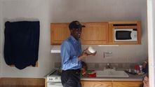 Внутри сделан макет жилого дома на котором показывают источники пожара и рассказывают про опасные электроприборы. На фото сотрудник объясняет зачем нужен датчик дыма, и насколько важно, чтобы они всегда находились в исправном состоянии.