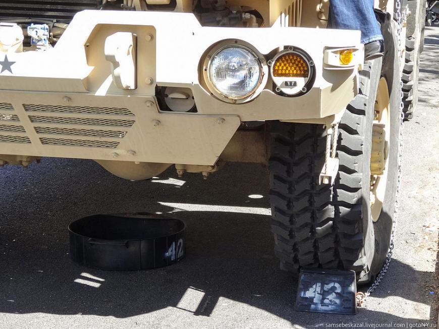У военных все сурово. Колодка на цепи под колесо и тазик для сбора капающего масла. Все пронумеровано.