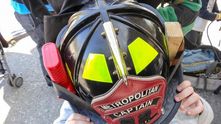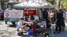 Рядом стоит стол, где разложены различные специальные аксессуары и униформа. Члены ассоциации отвечают на вопросы и рассказывают о работе пожарных.