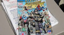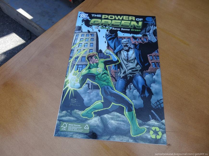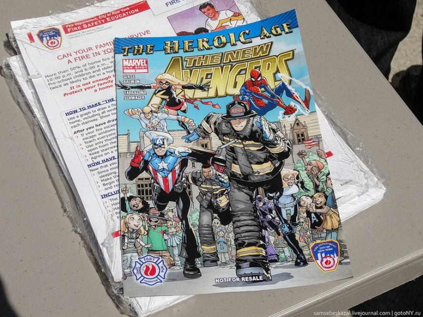 На столике лежат информационные материалы и комиксы про нью-йоркских пожарных. Они тут показаны, как настоящие супергерои. На вторых ролях Капитан Америка и Спайдермэн.