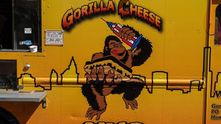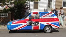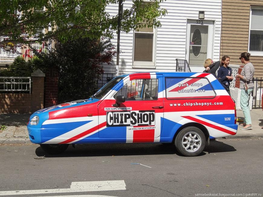 Неустойчивый британский трехколесный автомобиль, рекламирующий ресторан в Бруклине.