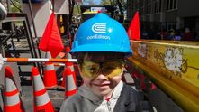 Детям рассказывают про электрические провода и дают примерить спецодежду.