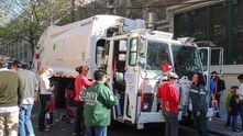 Водительница мусоровоза рассказывает ребенку о своей работе.
