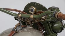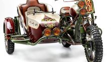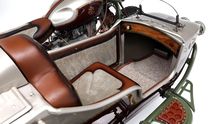 Стандартную подвеску заменили на новую, кастомную, а вместо переднего крыла применили фирменный кожаный грязезащитный щиток Le Mani Moto, который они ставят на все свои мотоциклы. Из других нестандартных элементов вы обнаружите сдвоенные передние фары на мотоцикле и коляске, новые передний щиток и бензобак иной формы.