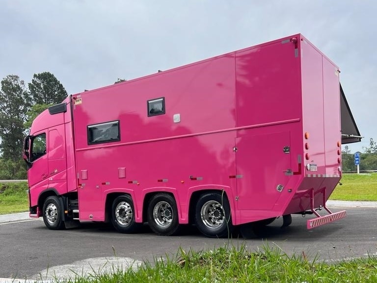 Trailercar — это завод по производству автодомов в Санта-Катарине. Недавно компания собрала для одного из своих клиентов красивый розовый дом на колесах на шасси Volvo FH 460 8X2 2020 года выпуска.