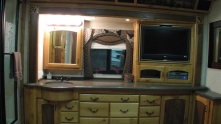 Автодом, который вы видите на фотографиях, был изготовлен в 2007 году. Интерьер выглядит немного устаревшим из-за обилия дерева и кожаной мебели тёмно-коричневого цвета.