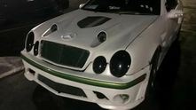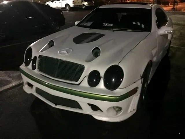 Перед вами Mercedes-Benz CLK, который получил довольно нелепые визуальные модификации. На капоте появилось странное отверстие в форме щита и два выступающих воздухозаборника. А трехлучевая звезда теперь как бы выпирает из капота.