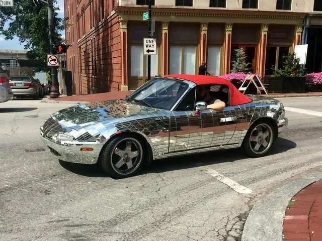 Если ты хочешь буквально блистать, проезжая на своём автомобиле по дорогам города, то стоит поехать в любую мастерскую, где кузов обклеят винилом "под хром". Но можно выпендриться, и использовать кучу лоскутков от зеркал, чтобы покрыть ими весь кузов.