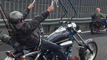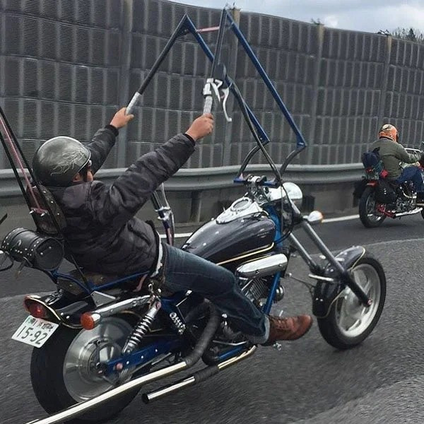 Любовь американских байкеров к задранным вверх рулям порой приобретает формы истинного издевательства. Посмотрите, какой руль себе сделал этот парень. Как вообще в такой позе можно ехать на мотоцикле и нормально держать равновесие?