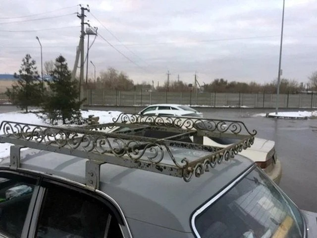 Самодельные багажники на крышу - вот что всегда было основной колхозного тюнинга в нашей стране. Посмотрите на это "чудо" с канделябрами и завитками, которое сделал своими руками владелец старенькой "Волги". Похоже на оградку, да?