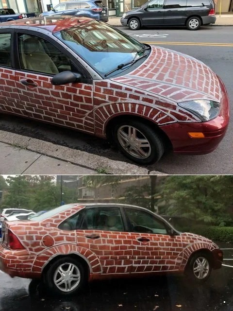 Знаете тех людей, которые выбирают для прихожей в своей квартире обои "под кирпич"? Оказывается, есть и такие люди, которые выбирают пленку "под кирпич" для обклейки кузова своего автомобиля. Креатив крайне странный и выглядит, честно говоря, не очень...