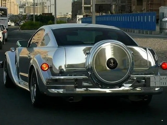 Арабы настолько безумные ребята, что готовы взять новенький Ford Mustang, чтобы превратить его в реплику классического автомобиля середины 30-х годов. Жаль, что мы не видим передней части, но центральным элементом задней является кофр для запасного колеса, закрепленный на заднем багажнике.