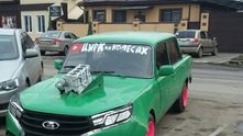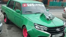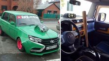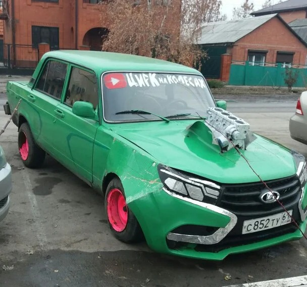 Кто-то похоже решил поиздеваться над дизайнерами АвтоВАЗа, попытавшись переделать ВАЗ-2107 в некое подобие Lada Vesta. Передняя решетка, бампер и капот — от Весты, а передние крылья и фары пришлось сделать из картона.