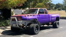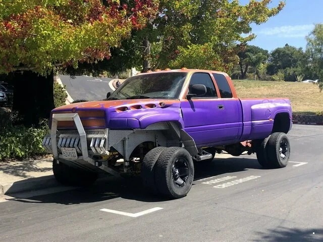 Старенький Dodge Ram превратили в безумного монстра с "жабрами" на боковинах капота, странным кенгурятником и сиренево-рыжим цветом кузова. Но самое нелепое — это сдвоенные передние колеса. Наверное, так внешний вид пикапа владельцу кажется более брутальным.