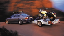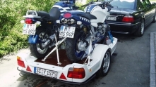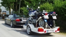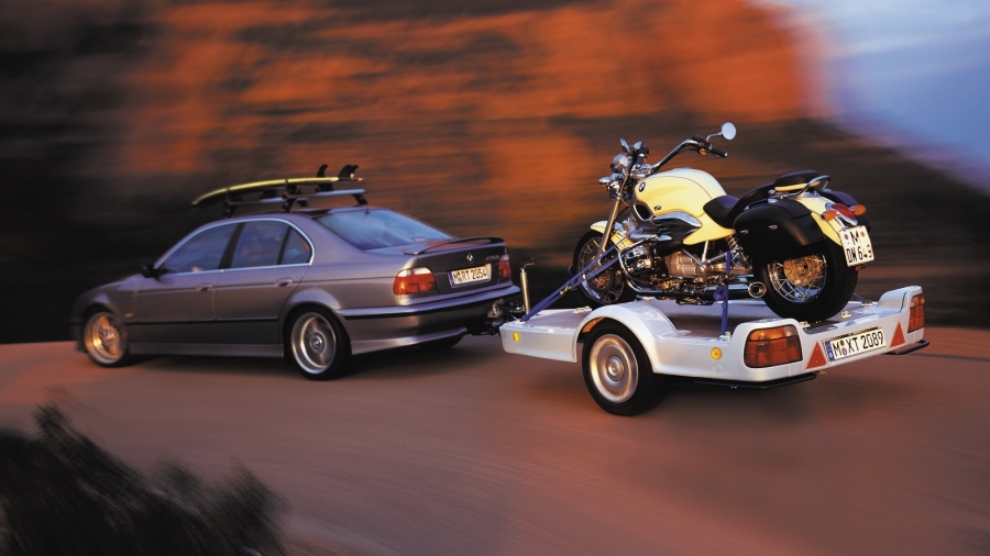 К счастью, BMW подумала и выпустила мотоциклетный комплект для Multi-Trailer. Он состоял из обруча для переднего колеса и креплений, и на самом деле выглядел как отличный способ буксировать мотоцикл за спортивным седаном.