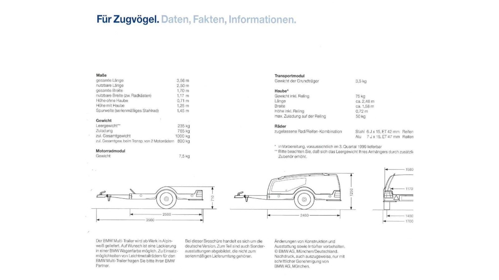 На те деньги тогда можно было купить два потрёпанных BMW. Лишь немногие клиенты согласились бы на такие траты, так что неудивительно, что Multi-Trailer был отмечен как «ENDED» (закончился) в каталоге запчастей BMW в 2004 году.