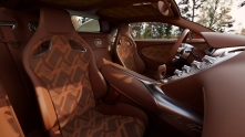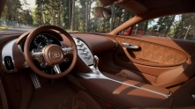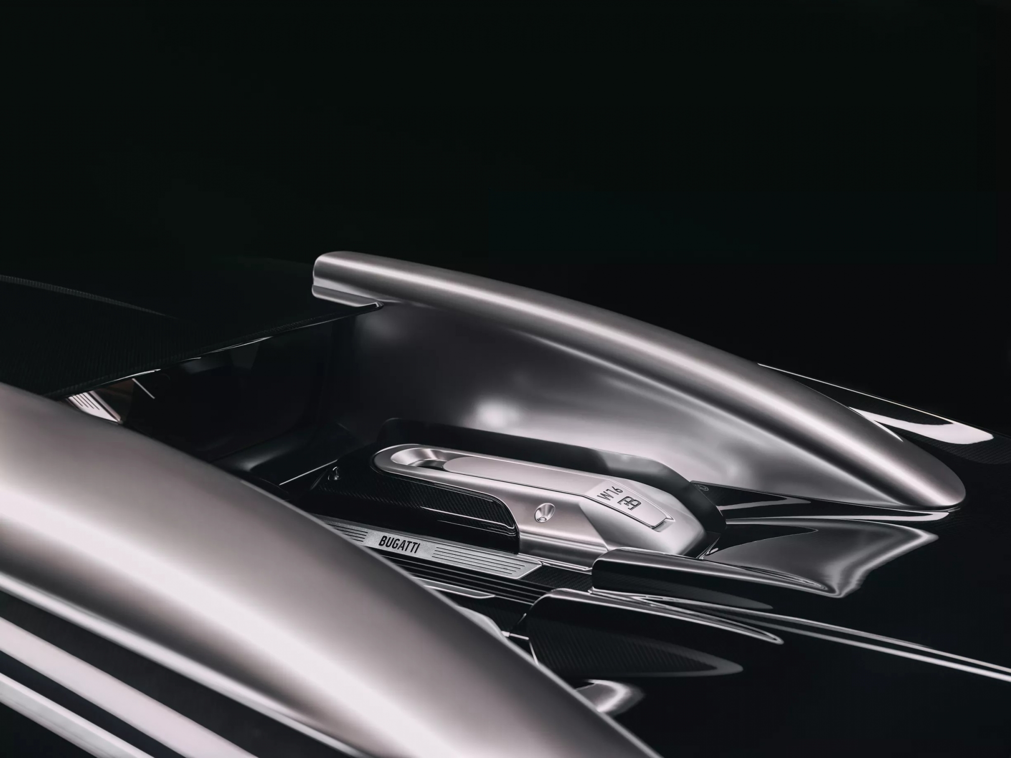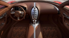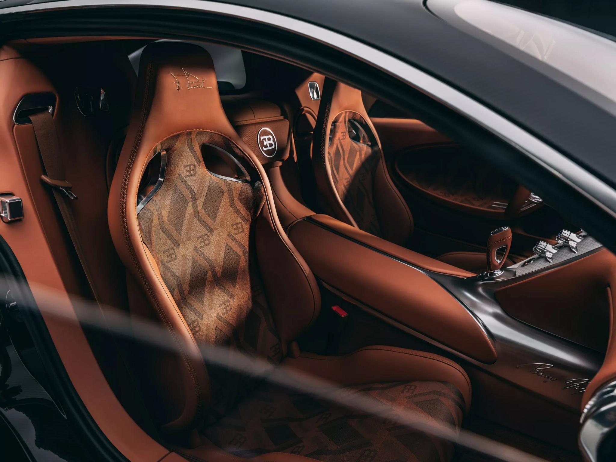 В салоне Bugatti идёт наперекор традиции «кожа везде». Рулевое колесо и уникальная алюминиевая центральная консоль выточены из цельной заготовки, а вместо сплошной кожаной отделки используются специально разработанные в Париже тканые материалы, придающие интерьеру более тёплое и индивидуальное ощущение.