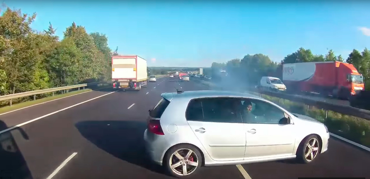 Водитель автобуса Mike Helm совершал свой привычный маршрут по трассе M40, когда заметил впереди серьезный дорожный инцидент. Не совсем понятно, что произошло, но похоже, что водитель автомобиля Golf не заметил замедлившийся поток впереди и применилл экстренное торможение, которое привело к неконтролируемому заносу.