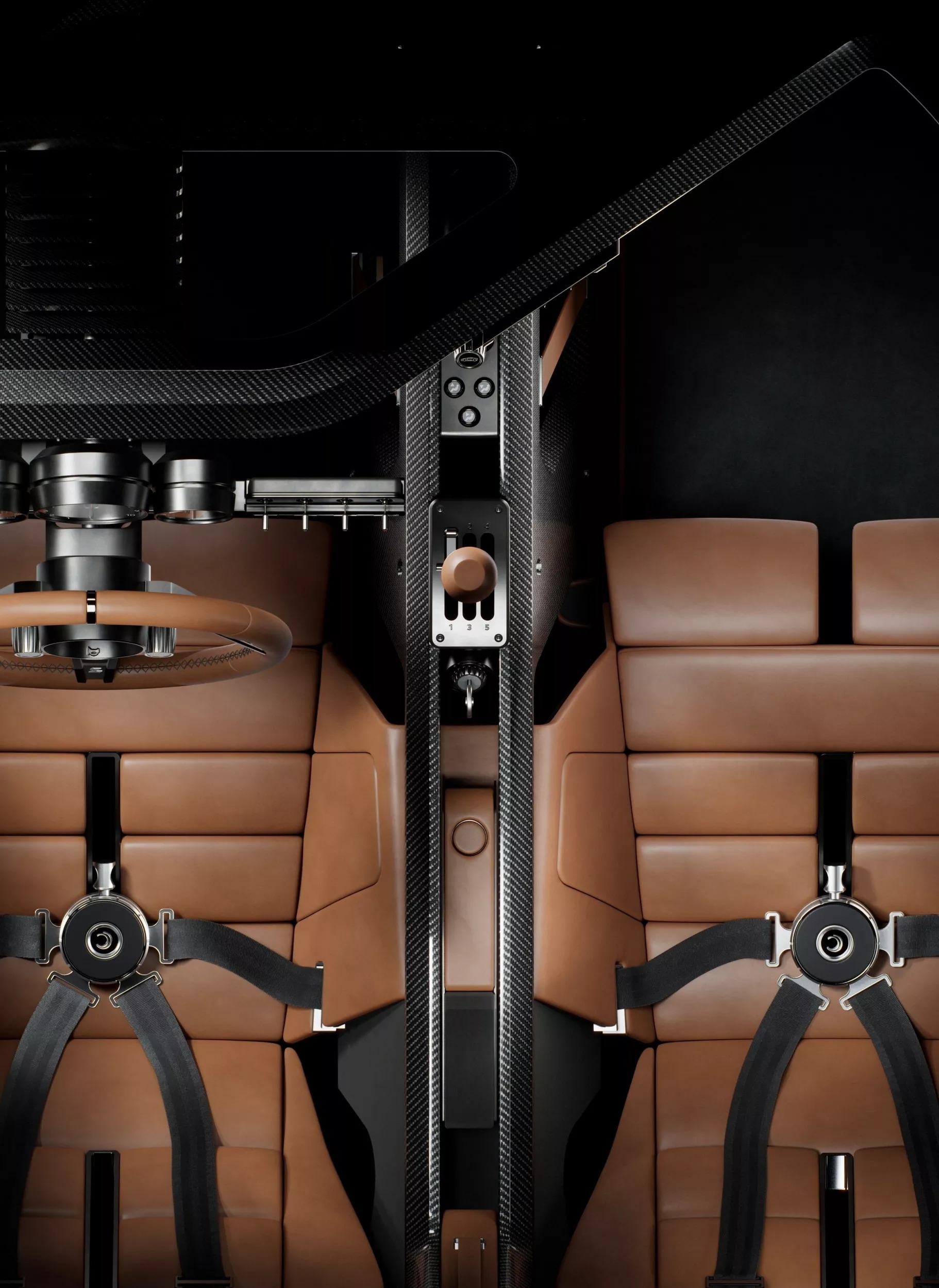 Все органы управления выточены из цельного титана и алюминия. В отделке — открытый карбон, алькантара и кожа Connolly.