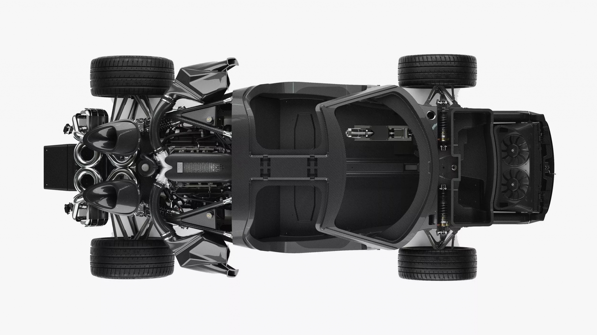 Результат — более 900 л.с. (662 кВт) и 1000 Нм крутящего момента. При массе менее 1200 кг (примерно как Mazda MX-5 RF с жёсткой крышей) это обещает взрывную динамику: разгон до 100 км/ч — менее трёх секунд, максимальная скорость — 360 км/ч.