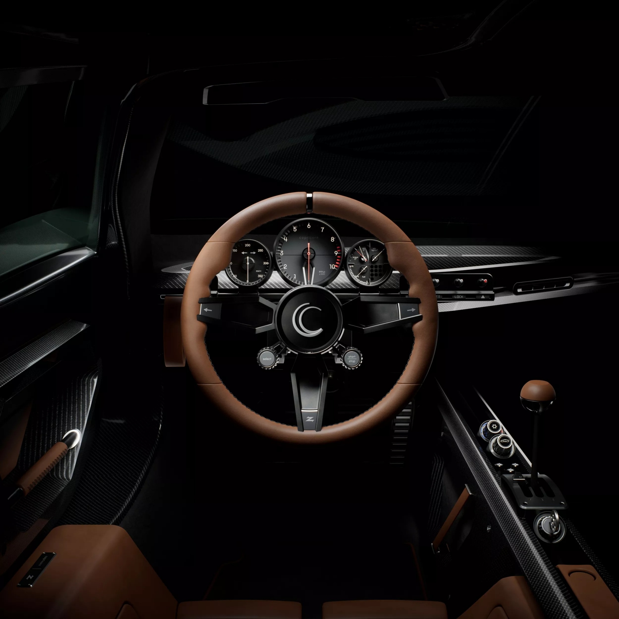 Интерьер разработан самой компанией Capricorn. Главный акцент — аналоговые приборы за круглым рулём, с крупным центральным тахометром. Ни следа от мультимедийных экранов — лишь небольшой дисплей камеры заднего вида, который прячется, когда не нужен.